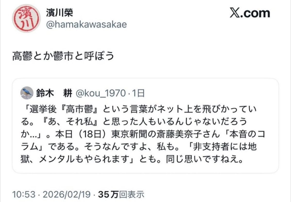 高市早苗首相について「高鬱とか鬱市と呼ぼう」と投稿した。