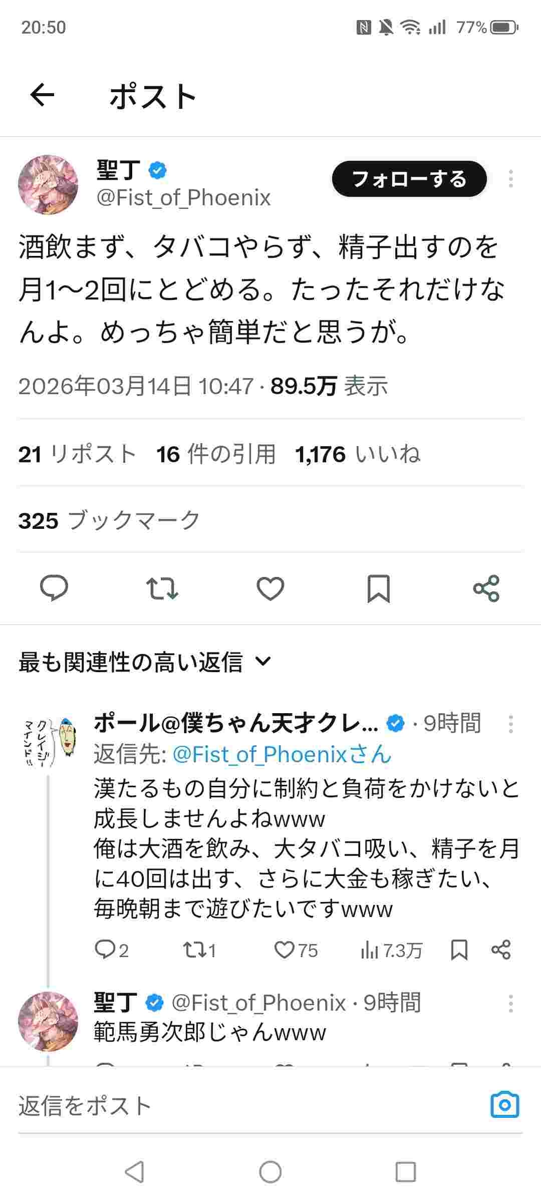 酒もタバコもやらないけど精子は25回は出すよ