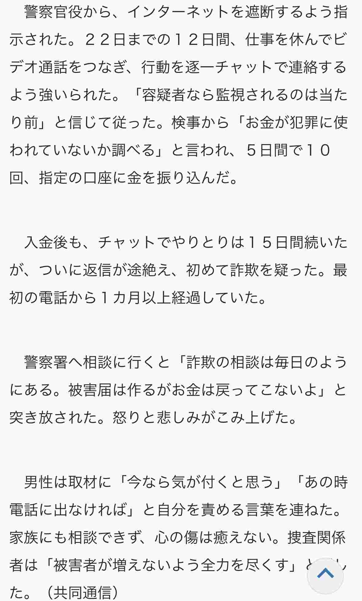 >入金後も、チャットでやりとりは15日間続いたが、ついに返信が途絶え、初めて詐欺を疑った。最初の電話から1カ月以上経過していた。