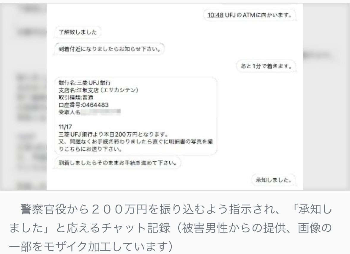 【画像】男性とニセ警察官を騙る詐欺グループとのチャット記録