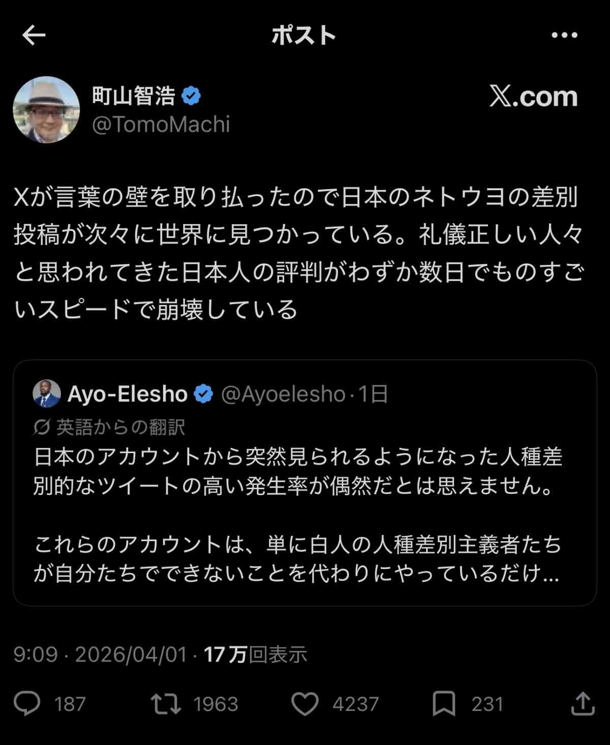 町山氏「Xが言葉の壁を取り払ったことで日本のネトウヨの差別投稿が次々に世界に見つかり、日本人の評判がわずか数日で崩壊した」