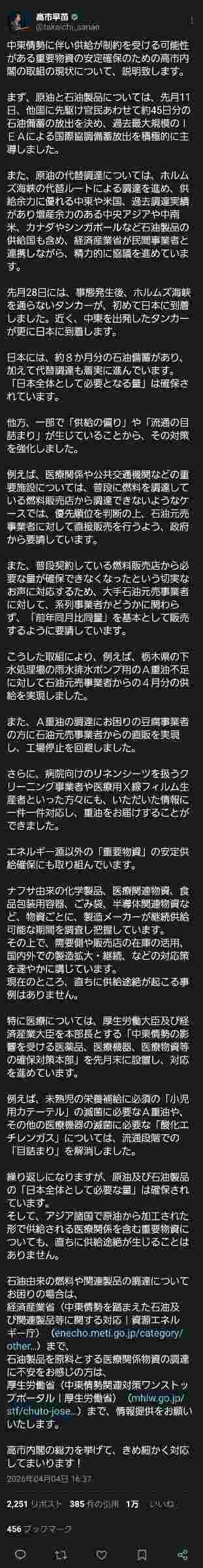 そして、アジア諸国で原油から加工された形で供給される医療関係を含む重要物資についても、直ちに供給途絶が生じることはありません。』