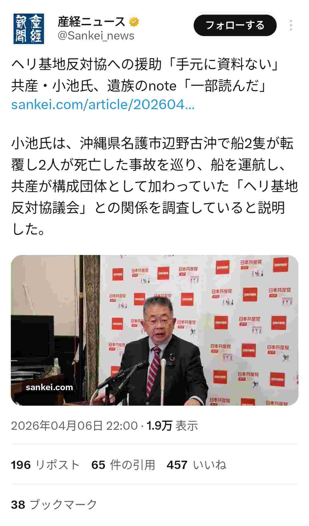 記者「辺野古で事故を起こした抗議船の船長が共産党員であるという情報が出ていますが、党として何らかの声明はありますか?」