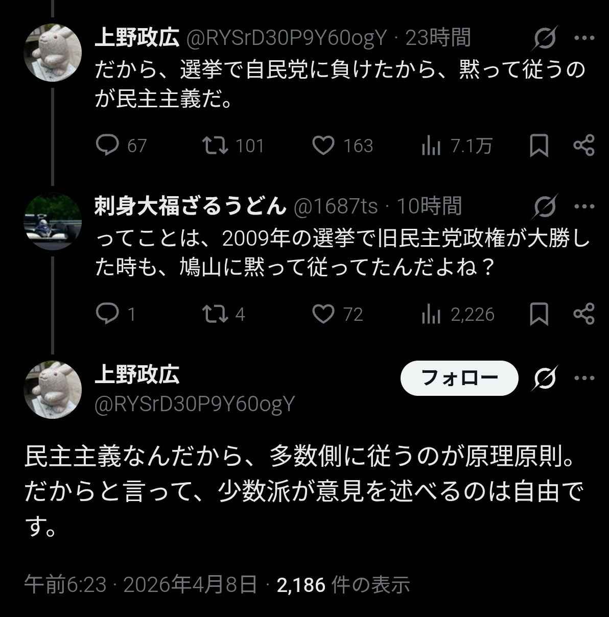【芸術】高市支持者「選挙で自民が勝ったら従うのが民主主義」「鳩山は?」「少数派が意見を述べるのは自由」