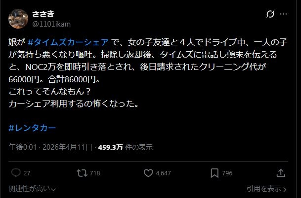 タイムズカーシェアで嘔吐し汚損した女さん四人組さん、後日86000円請求されて怖くなる