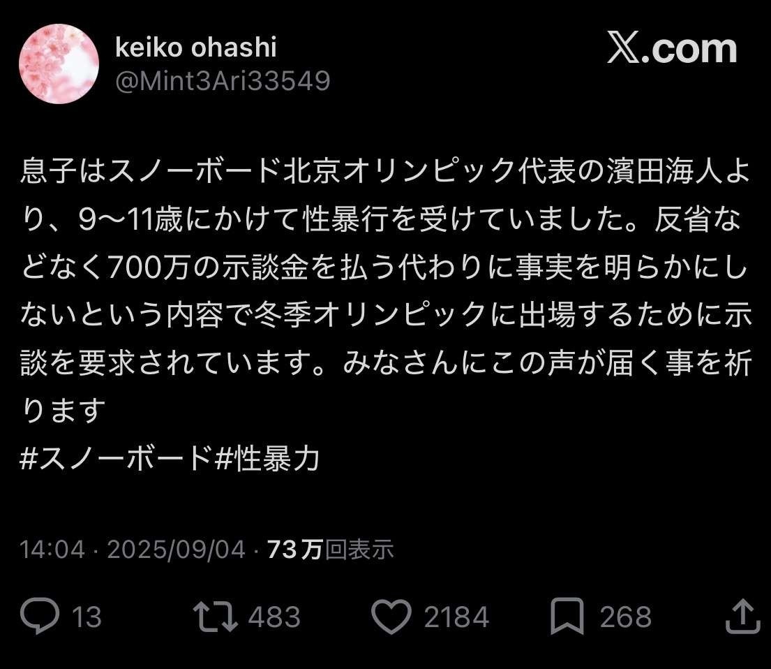 被害に遭った男性の母親だと名乗るX(旧Twitter)アカウント「keiko ohashi」が25日、「私の息子が北京オリンピック日本代表の濱田海人から受けた性被害を公表します。」と投稿。