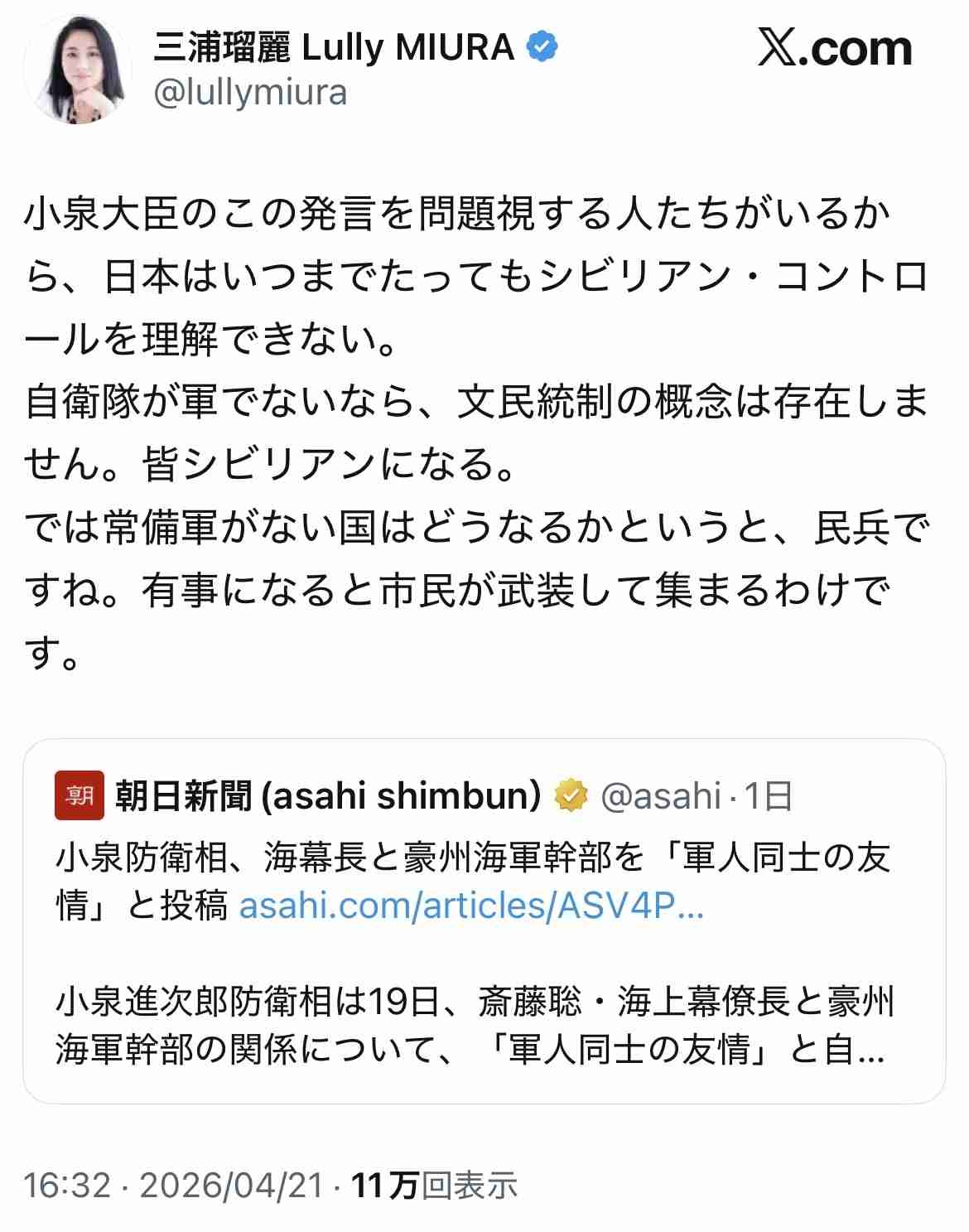 自衛官は「文民ではない者」っていう判例すら知らない馬鹿が三浦瑠麗