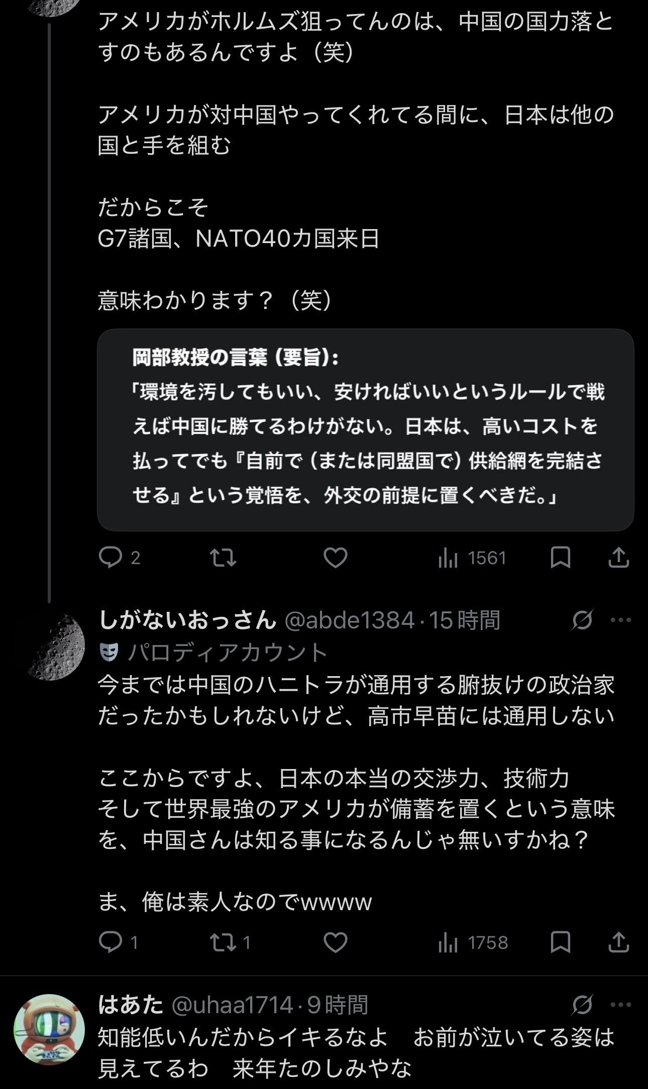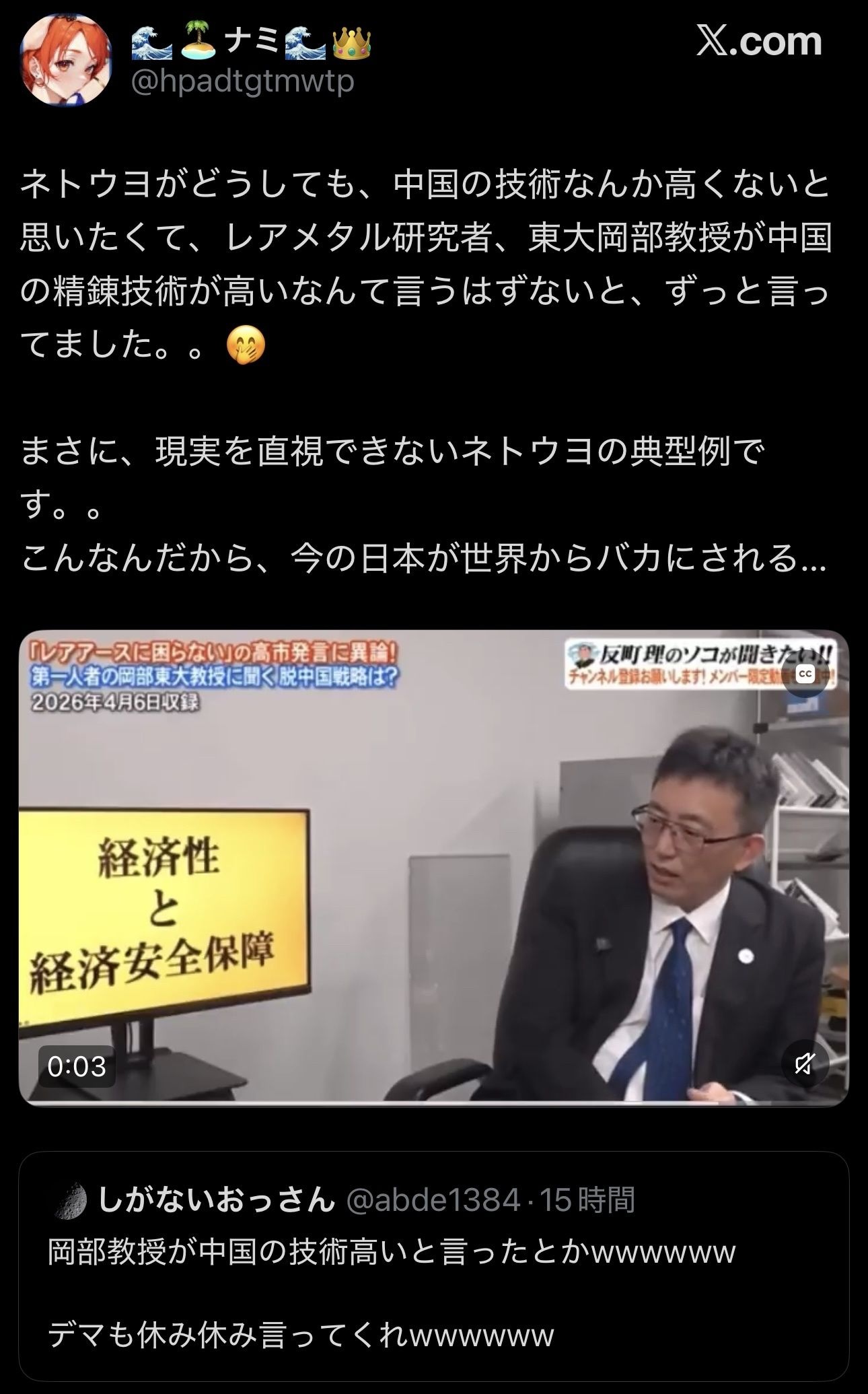 レアアース界の権威、東大岡部教授「日本で採れたレアアースは中国持っていくのが一番いい。中国は技術力もある」→ネトウヨ発作w
