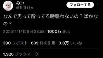 嫌儲 女子「なんで男って酔ってる時襲わないの?ばかなの?」→38000いいね!酔った女はセクロスを求めてることが判明