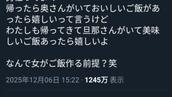 VIP 女さん「帰ったら奥さんにご飯作って貰ったらうれしい?あのさぁ…なんで女が作るの?(笑)」→12万いいね!