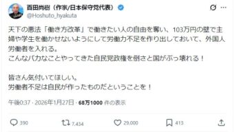 嫌儲 百田尚樹「残業上限化や103万円の壁が日本人労働力不足、外国人労働者の受け入れの原因、自民党を倒さないと国が倒れる