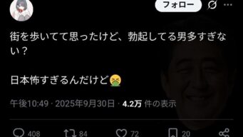 嫌儲 まんさん「日本って街なかで勃起してる男多くない?」咽び泣く