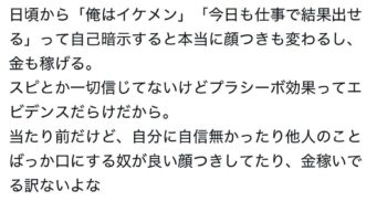 嫌儲 強者男性「日頃から「俺はイケメン」って自己暗示すると本当に顔つき変わる。プラシーボ効果ってエビデンスだらけだから」