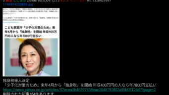 なんG 三原じゅん子大臣「『独身税』では決してない。『全国民から徴収して子育て世代に使う』ものです」